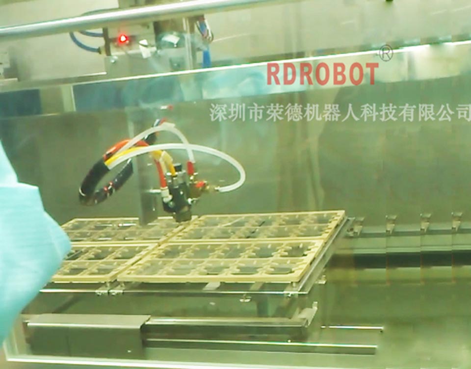 为保证防指纹膜层均匀性及在玻璃的附着性,荣德研发的AF防指纹药液自动喷涂设备是第一段配有等离子处理,第二段是采用往复式喷涂方式,第三段配有无尘表干隧道炉,自动表干,防止后续落尘,结合药液的物理特性,配合精确的压力及喷幅。使得各点膜层的密度误差在3%以下。这种工艺可以大大提高膜层与玻璃的附着力。