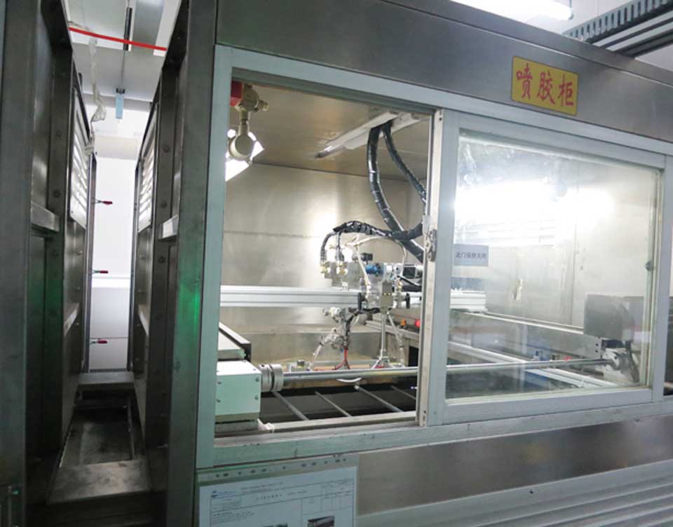 工艺流程:自动打毛→上喷胶输送线→加热AB胶→自动喷胶→自动喷砂→机械手自动抓取到排料线→机械手自动抓取到烘干线→烘干—冷却—下件(非标定制)